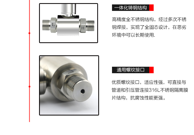 SIN-6100系列一體化差壓變送器采用OEM硅壓阻式差壓充油芯體組裝而成。外殼為全不銹鋼結構,兩個壓力接口為螺紋連接,可直接安裝在測量管道上或通過引壓管連接。