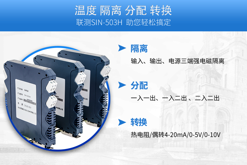 將PT100等熱電阻跟熱電偶信號轉換成各種電流、電壓等標準模擬量信號,可以與PC機、PLC、DCS等實現工控監測連接??垢蓴_能力強,遠傳不受其他設備影響。輸入、輸出選擇范圍寬,準確度高。電源可選擇,導軌安裝便于檢測與安裝。廣泛應用于各種對溫度集中測量的監控系統中。