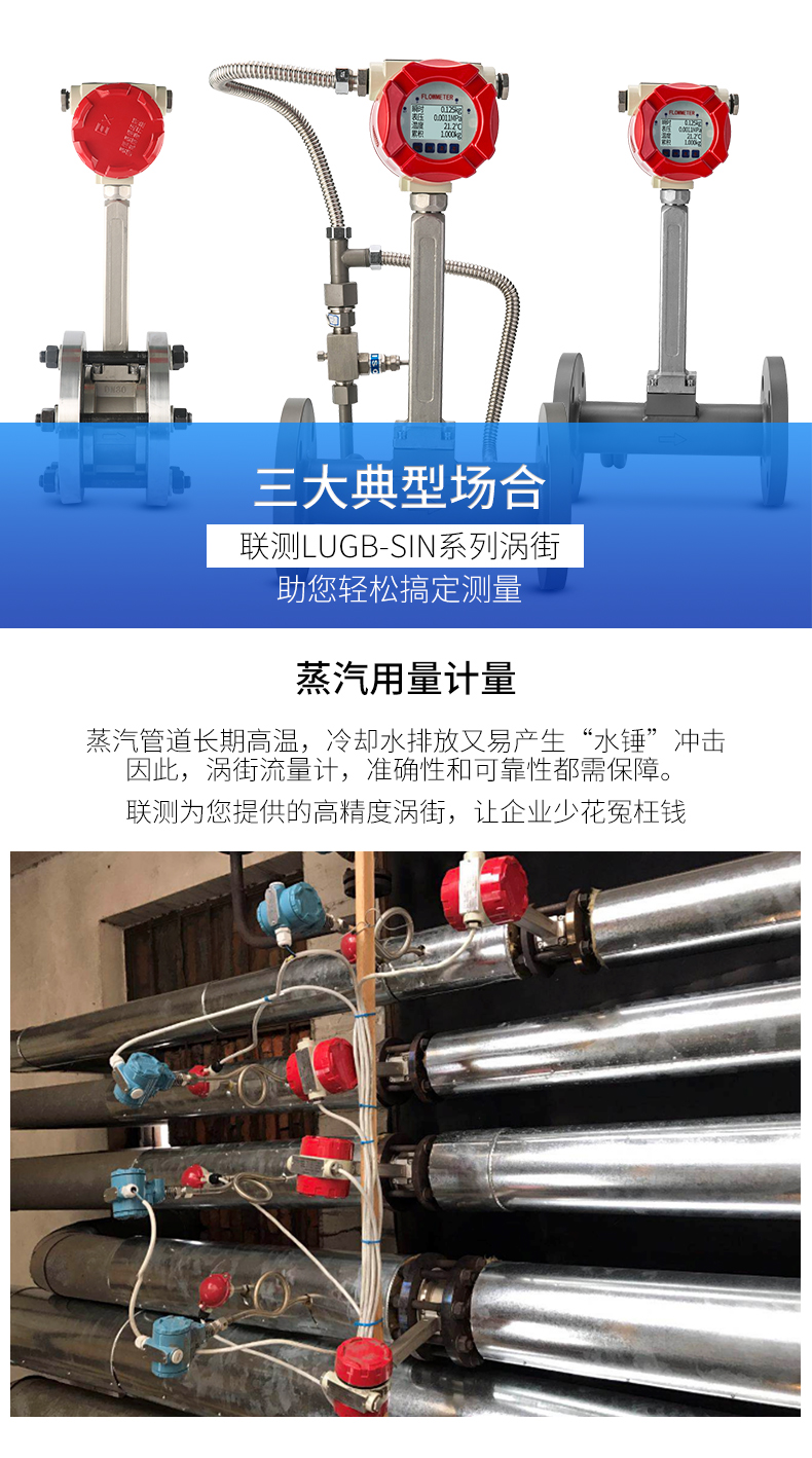 LUGB-SIN-A渦街流量儀表廣泛用于供熱公司、熱力公司、化工行業(yè)等行業(yè),對過熱蒸汽、飽和蒸汽、壓縮空氣和一般氣體、水和液體的計(jì)量和控制。加厚本體,可有效避免現(xiàn)場管道振動帶來的數(shù)據(jù)波動和誤差。多用于高溫場合,例如過熱蒸汽等工況。