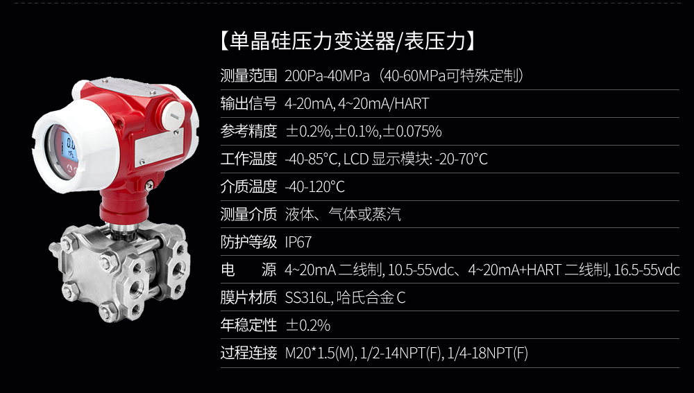 SIN-P3000G單晶硅壓力變送器用于測量液體、氣體或蒸汽的液位、密度、壓力,然后將其轉變成4-20mAHART電流信號輸出,也可與HART375或BST Modem相互通信,通過他們進行參數設定、過程控制。與傳統壓力變送器的區別在于它使用的是納米單晶硅作為傳感器材料。
